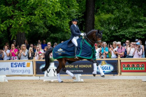 Vor der herrlichen Kulisse des Schloss Bieberich in Wiesbaden feierte die außergewöhnliche internationale Dressurserie MEGGLE Champion of Honour die zweite Station ihrer inzwischen fünften Saison. Und einmal mehr überzeugte die Pferdewirtschaftsmeisterin und Championatsreiterin Dorothee Schneider, die bereits zwei Mal die Gesamtwertung und somit den prestigeträchtigen Titel MEGGLE Champion of Honour over all für sich in Anspruch nehmen durfte.