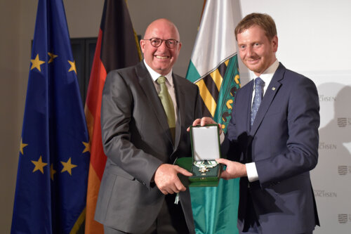 Ministerpräsident Michael Kretschmer überreicht Volker Wulff den Verdienstorden des Freistaates Sachsen.