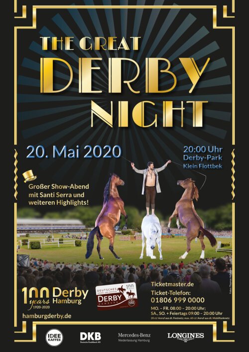 Hamburg – Das Deutsche Spring- und Dressur-Derby, präsentiert von IDEE KAFFEE wird dieses Jahr 100 Jahre alt. Einen 100. Geburtstag zu feiern, ist für sich schon legendär. Aber was passiert, wenn ein Turnier, das sowieso schon Kultstatus hat, dieses legendäre Jubiläum erreicht? Es wird gefeiert, und zwar par excellence! Das Derby wird die 1920er Jahre wiederaufleben lassen. Auftakt und Highlight der Feierlichkeiten zugleich ist „The Great Derby Night“ am Mittwoch, den 20. Mai 2020. Eine exklusiv gestaltete Show und ein prächtiges Fest im V.I.P.-Bereich lassen ein Feuerwerk an Acts im Derby-Park steigen.
