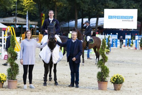 Paderborn  – Mit dem Preis der Bremer AG ist die erste Prüfung der großen Tour bei der OWL Challenge auf dem Paderborner Schützenplatz entschieden. In dieser internationalen Springprüfung nach Fehlern und Zeit durften die Reiter keinesfalls im Parcours bummeln, denn es gibt kein Stechen. Es siegt, wer im Umlauf sowohl fehlerfrei war, als auch die schnellste Zeit hatte. Und das gelang am Freitagabend dem für schnelle Ritte bekannten amtierenden Deutschen Meister Felix Haßmann (Lienen). Im Sattel des erst neunjährigen Westfalenwallachs Sig Black Panther rollte er als vorletzter Starter das Feld von hinten auf und ließ der Konkurrenz keine Chance. „Sig Black Panther hat schon in der Youngster Tour viel gewonnen und ist einfach ein grundschnelles Pferd. Auch die coronabedingte Pause hat ihm gar nicht geschadet. Er ist überhaupt nicht guckig, ganz relaxt und ist sofort wieder gut in die Turniere eingestiegen“, schwärmt Haßmann von seinem noch jungen Sportpartner. Zweiter der Prüfung wurde Benjamin Wulschner (Dahlen) mit Quidditsch. Platz drei ging an Tim Rieskamp-Gödeking (Steinhagen) mit Chico Bonito.