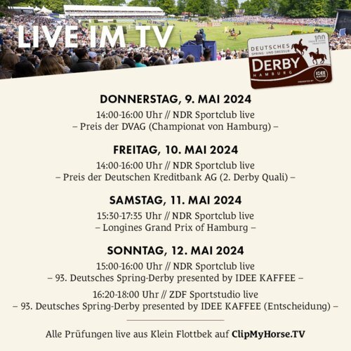 Hamburg – – Der Ticketverkauf zum diesjährigen Deutschen Spring- und Dressur-Derby presented by IDEE KAFFEE lief überdurchschnittlich, Tribünentickets sind in einigen Kontingenten ausverkauft. Restkarten gibt es noch für diejenigen, die dieses ganz besondere Derby-Feeling hautnah miterleben wollen, zum Beispiel auch in der neu eingerichteten Derby-Lounge. Aber auch für diejenigen, die nicht in den Derby-Park kommen können, gibt es Live-Übertragungen in Hülle und Fülle. Der NDR und das ZDF haben wieder eine umfangreiche Berichterstattung geplant mit Live-Übertragungen aus Klein Flottbek, aber auch mit spannenden Infos rund ums Derby.