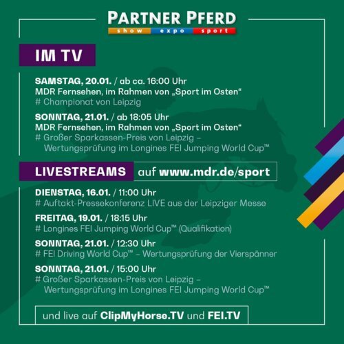 Am Sonntag, 21. Januar, wird im Rahmen der Sendung „MDR – Sport im Osten“ ab 18.05 Uhr die Entscheidung im Großen Sparkassen-Preis von Leipzig, gleichzeitig Qualifikation zum Longines FEI Jumping World Cup™ als Zusammenfassung gezeigt. Die komplette Prüfung live gibt es schon ab 15:00 Uhr online im Stream auf MDR.de/sport.