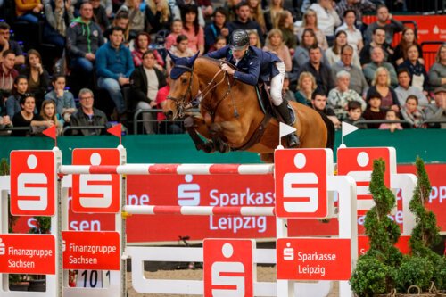 Auf Platz drei im Sparkassen-Cup – Großer Preis von Leipzig ritt Marcus Ehning (Borken) mit dem einzigartig springenden Comme il faut: „Er ist die letzten drei Jahre im Weltcup-Springen null gegangen. Sowas hat man auch nicht so oft“, lobte Ehning den Hengst. „Den Umlauf ist er sehr sicher gesprungen. Im Stechen bin ich am Anfang nicht richtig in Gang gekommen, aber ich bin auch mit dem dritten Platz glücklich. Und die Stimmung in Leipzig war mal wieder gewaltig.“